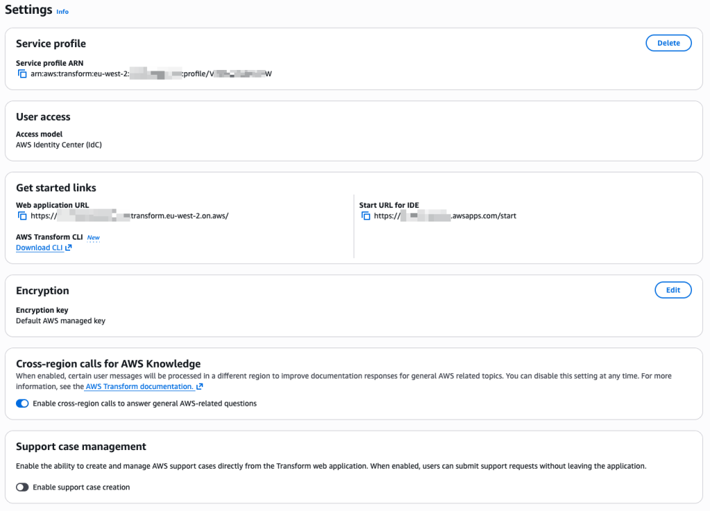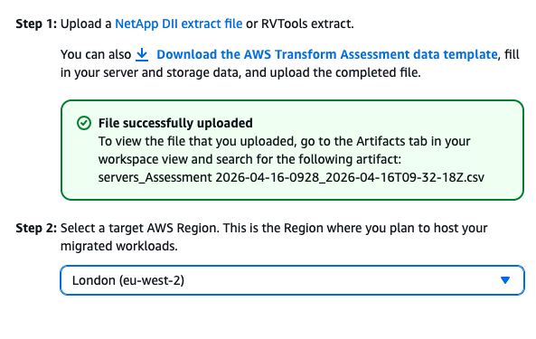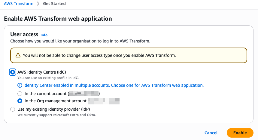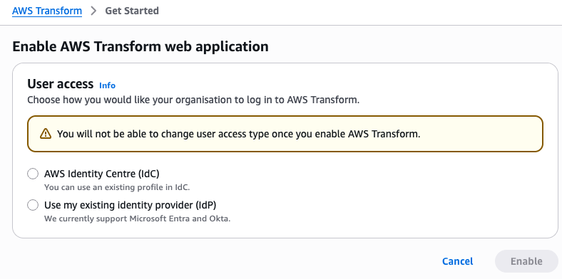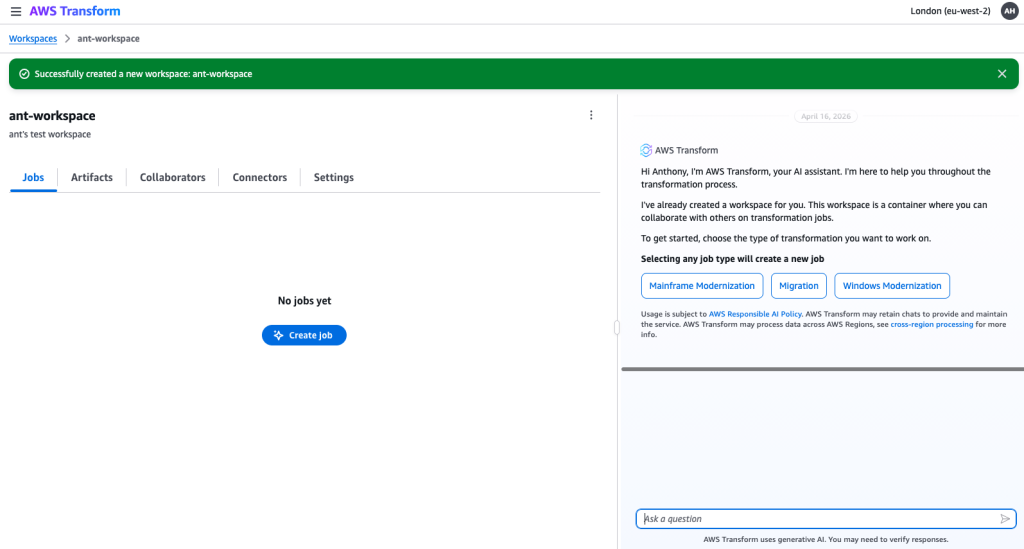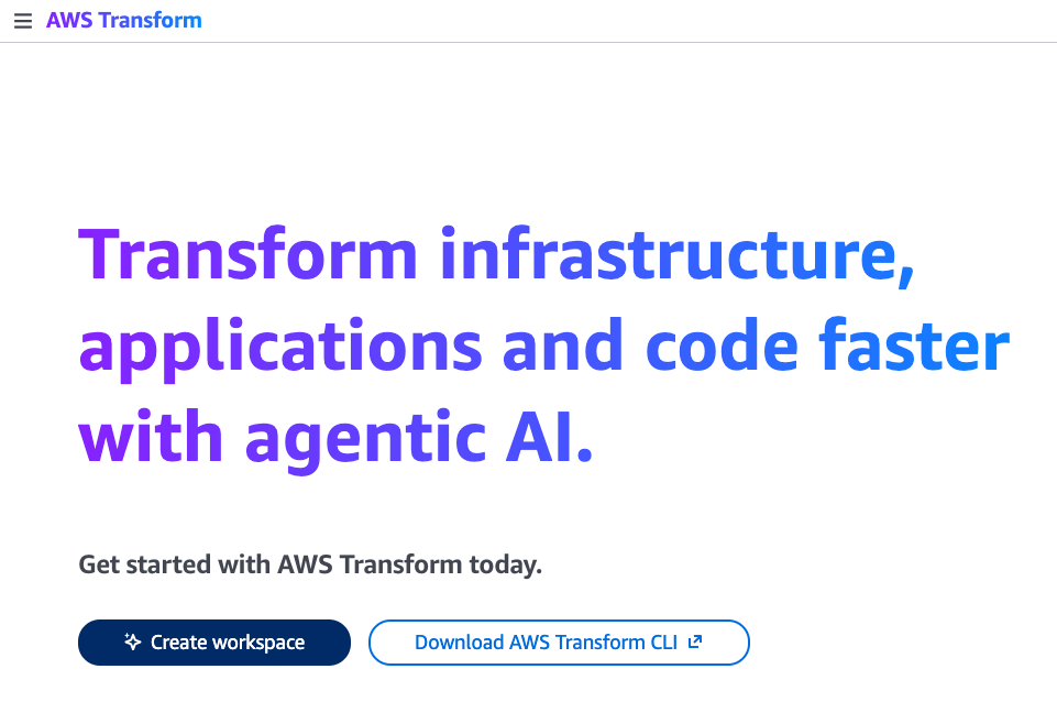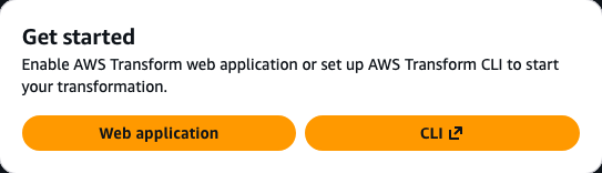 For this walk-through I’m going to use the Web application, in the AWS Console navigate to AWS Transform selecting the correct region, and then Web application: