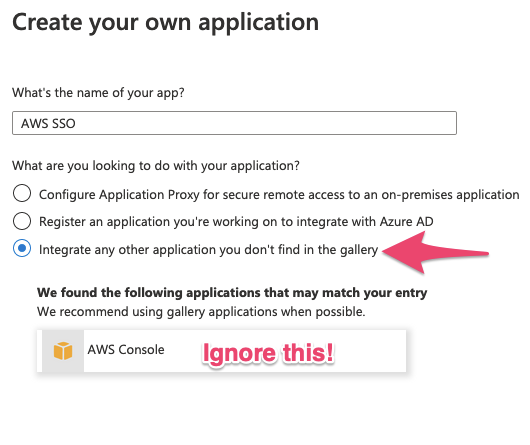 Next, navigate to ‘Enterprise Applications’ and select ‘+ New application’. Once the Azure AD Gallery has loaded, select ‘+ Create your own application’ – don’t be tempted to use the Amazon Web Services gallery offerings – they don’t currently leverage AWS SSO at the AWS side.