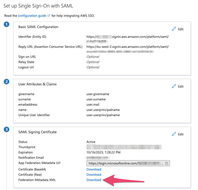 Click away from the ‘Single sign-on’ panel, and then click back into it – and now select Download against the Federation Metadata XML option: