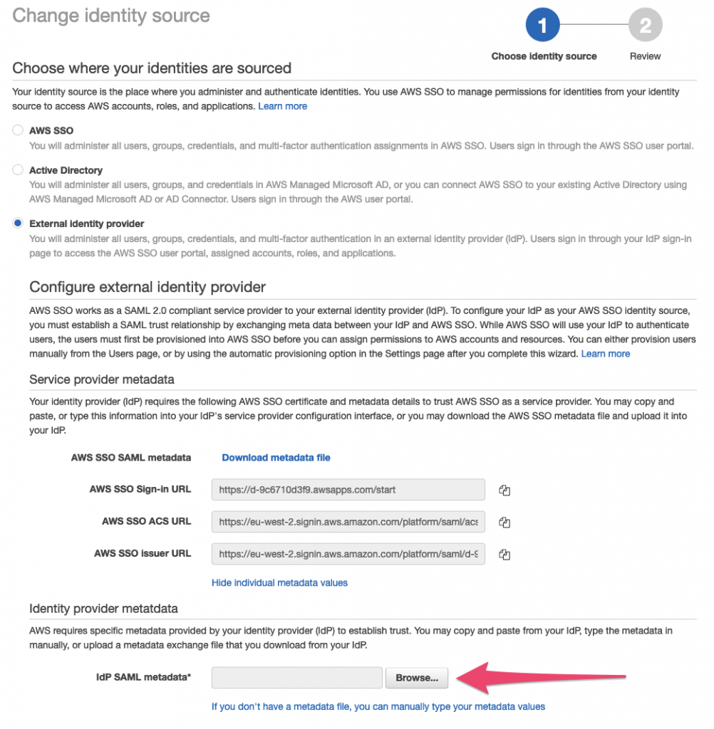 Back in the AWS portal, select the file you’ve just downloaded for the IdP SAML metadata and upload it: