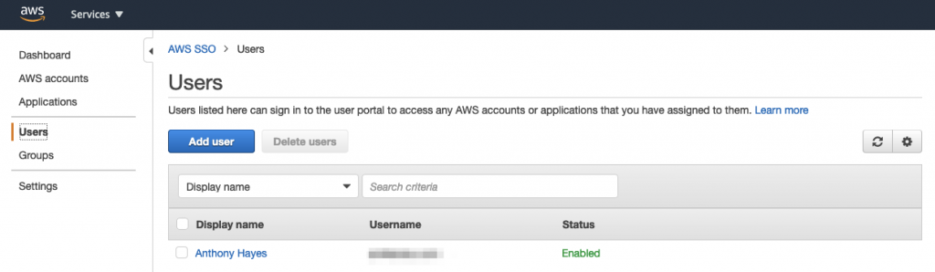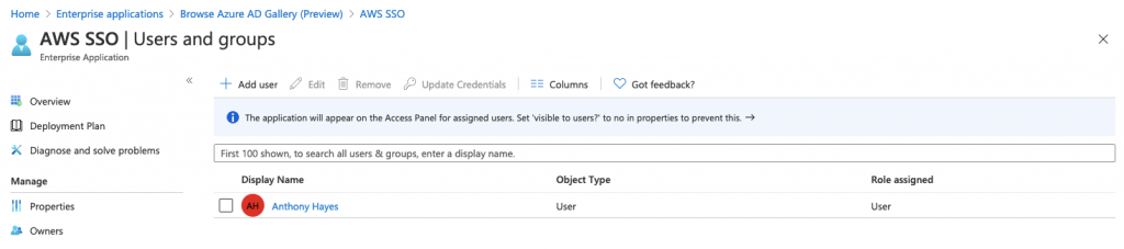 Over in the AWS SSO console add the user to the app (I’ll cover enabling automatic provisioning in a future blogpost)
