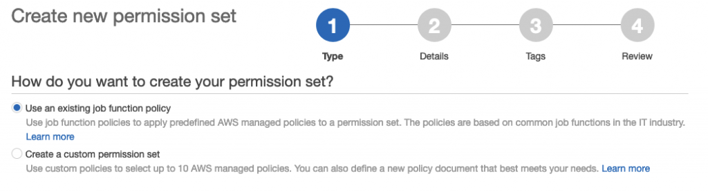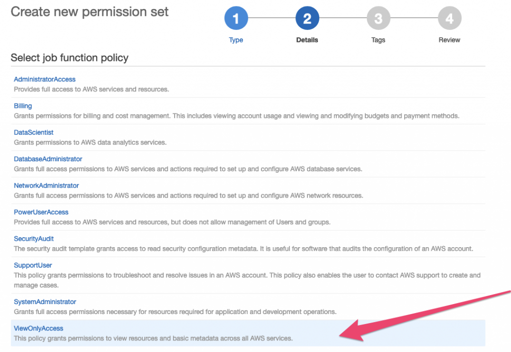 I’ll select Use an existing job function policy to enable a ‘Read Only’ user to the AWS Console: