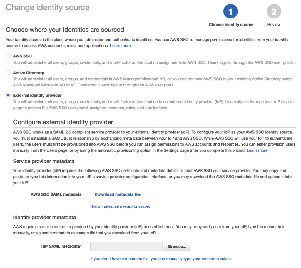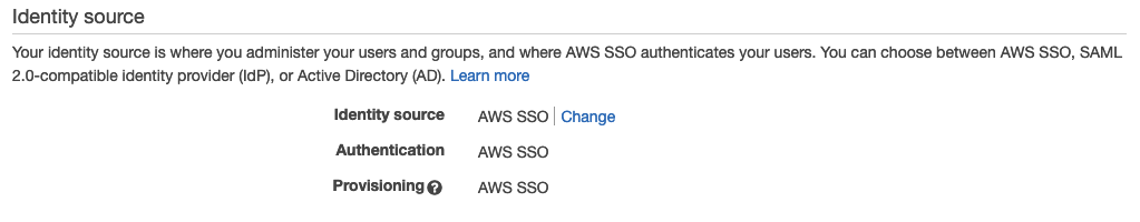 The first thing to do in the AWS SSO console is to choose the identity source, under the Settings option click on the ‘Change’ option next to ‘Identity Source’:
