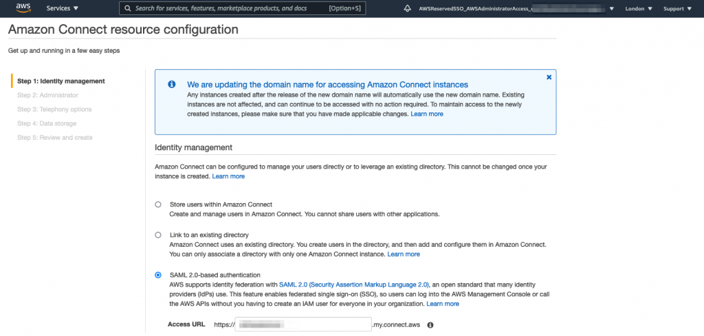 I’m going to use SAML 2.0 based authentication for my Connect instance, so I select that radio button and then ‘Next Step’, where I’m prompted for details to add an Administrator user: